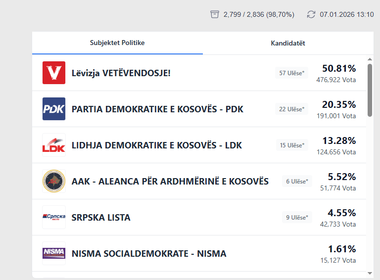 Në bazë të të dhënave aktuale, Lëvizja Vetëvendosje vazhdon të kryesojë me 50.81 për qind të votave dhe 57 mandate, e ndjekur nga Partia Demokratike e Kosovës (PDK) me 20.35 për qind dhe 22 mandate.