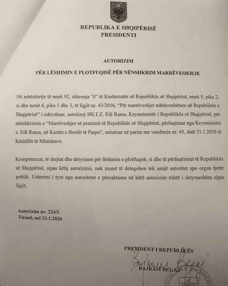Presidenti i Republikës, Bajram Begaj, ka autorizuar sot Kryeministrin Edi Rama për të nënshkruar marrëveshjen e aderimit të Shqipërisë në Kartën e Bordit të Paqes, një iniciativë ndërkombëtare për promovimin e stabilitetit dhe paqes në zonat e konfliktit.