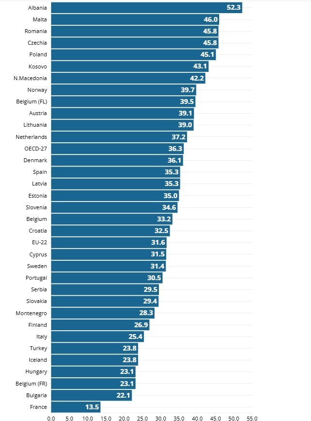 Përqindjet e tyre ishin: Malta (46%), Çekia (46%), Rumania (46%), Polonia (45%), Kosova (43%), Maqedonia e Veriut (42%), Norvegjia (40%) dhe rajoni flaman i Belgjikës (40%).