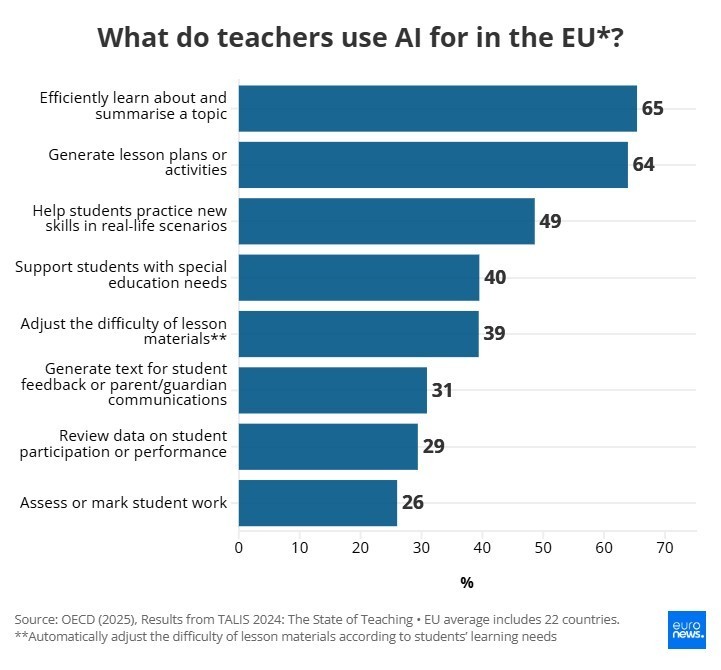 Nga mësuesit që përdorin AI-në, mesatarisht në Bashkimin Evropian (EU-22), pothuajse dy të tretat (65 për qind) thonë se e përdorin për të mësuar në mënyrë efikase dhe për të përmbledhur një temë, dhe 64 për qind përdorin AI-në për të gjeneruar plane mësimore ose aktivitete.