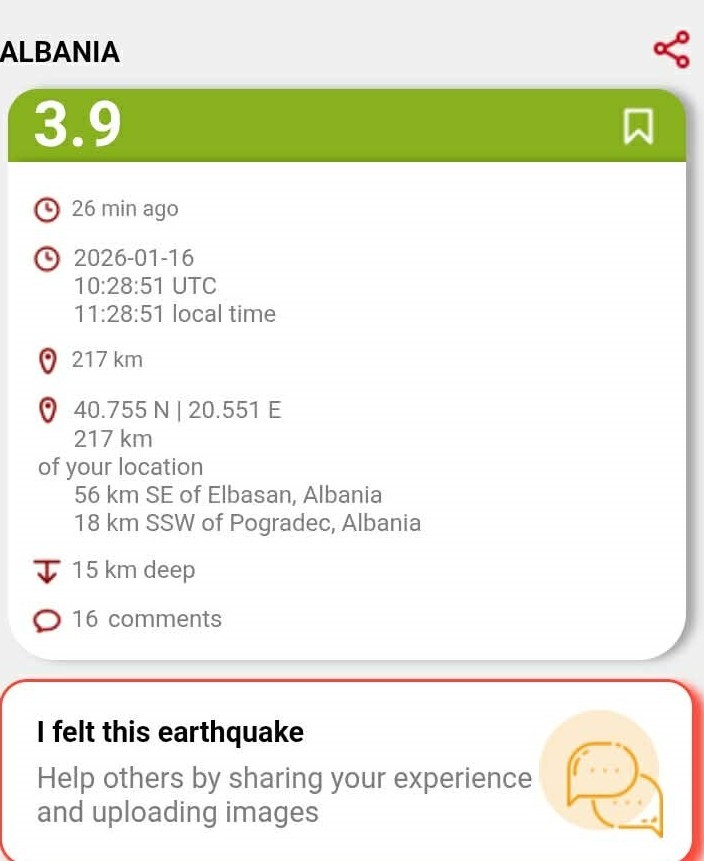Një tërmet i shkallës 3.9 Rihter ka ndodhur sot në ora 11:28 në Shqipëri.